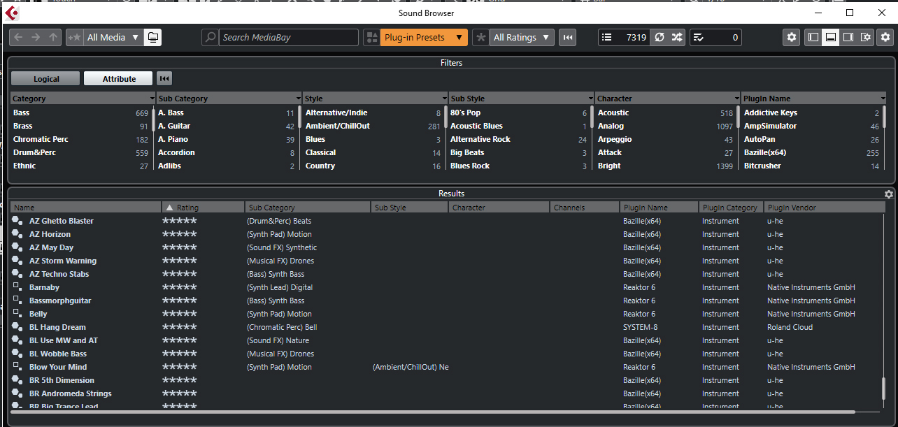 Cubase has this media library that I find super useful. You can do things like save patches from your VSTs into it, then give them a category (“New Age” or “Experimental” etc), and give them a rating on a scale from 0 to 5.